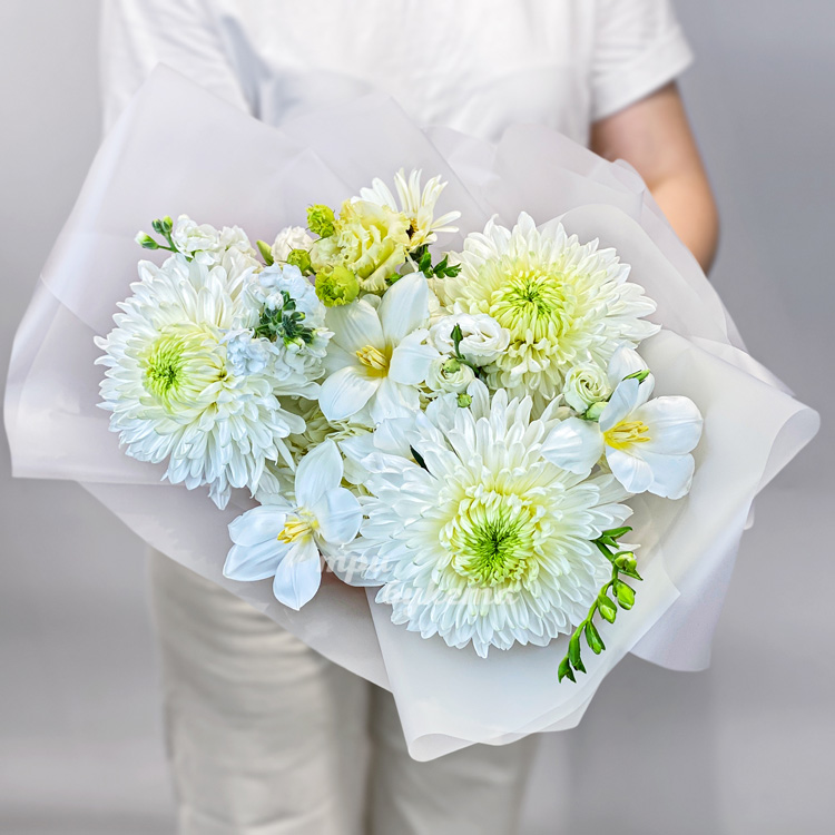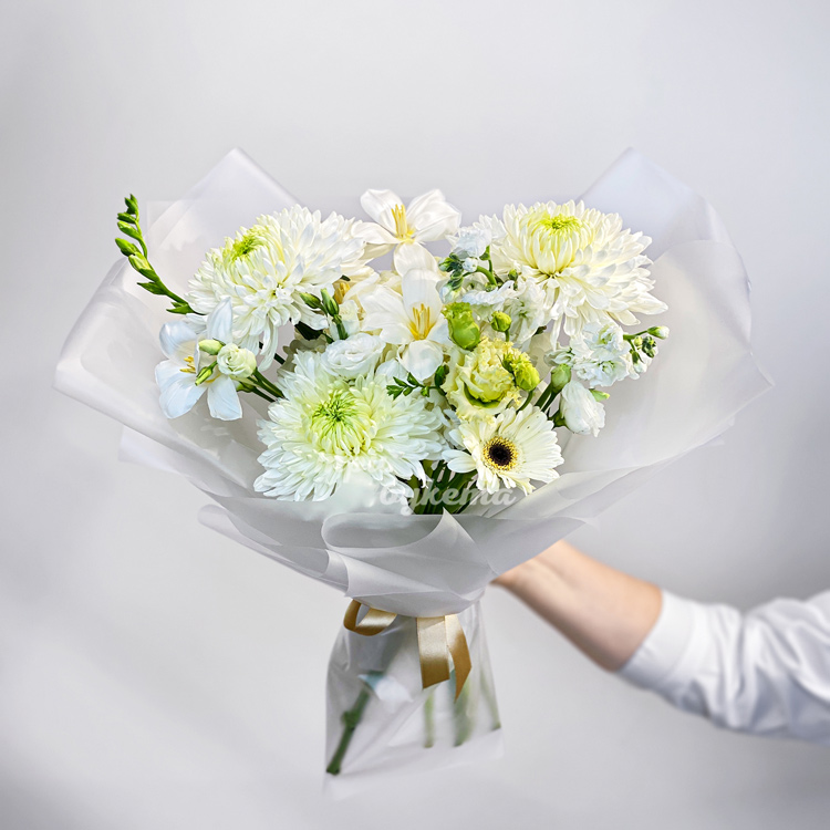Букет белых тюльпанов, хризантем и эустом