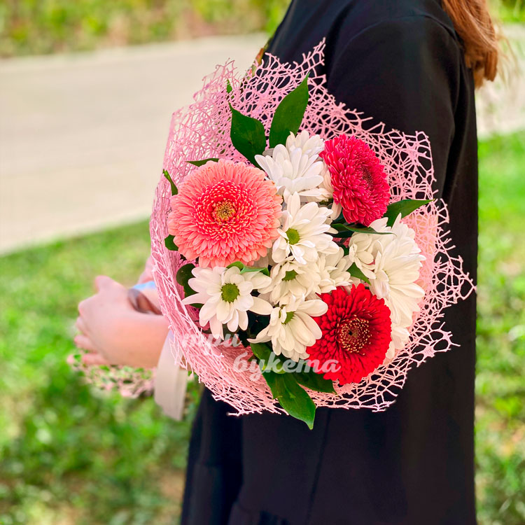 Герберы и хризантемы в розовом сизале