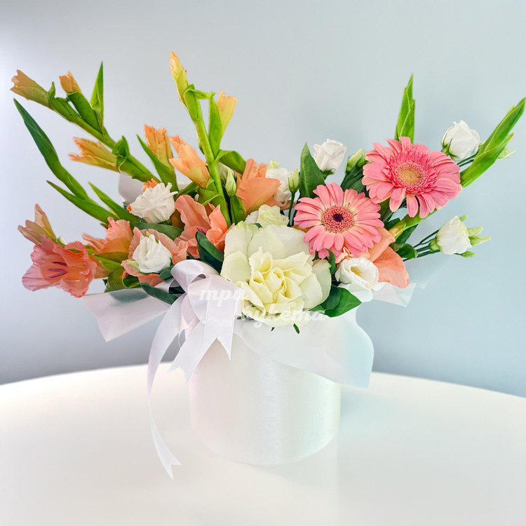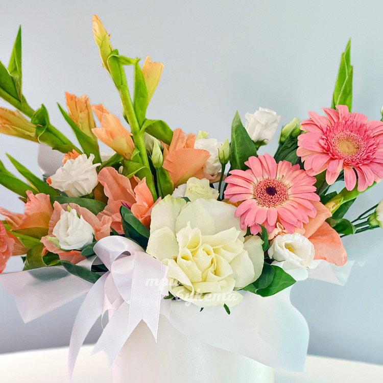 Коробка гладиолусов, эустом и гербер