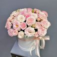 Коробка розовых гвоздик, роз и гортензии