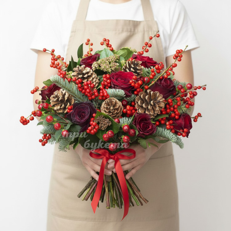 Новогодний букет из бордовой розы