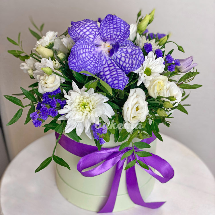 Орхидея Ванда с эустомами в коробке