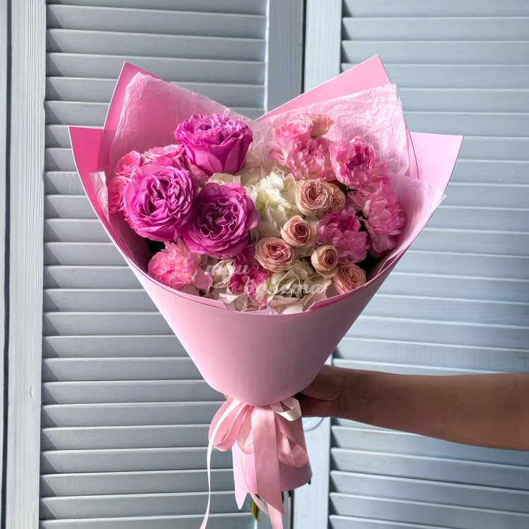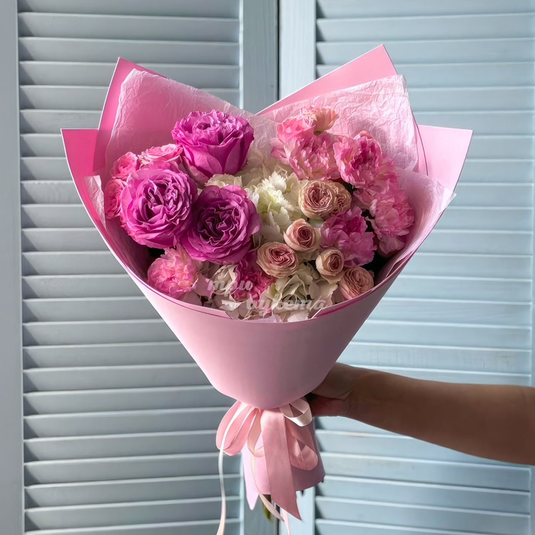 Розовый букет гвоздик и роз с гортензией
