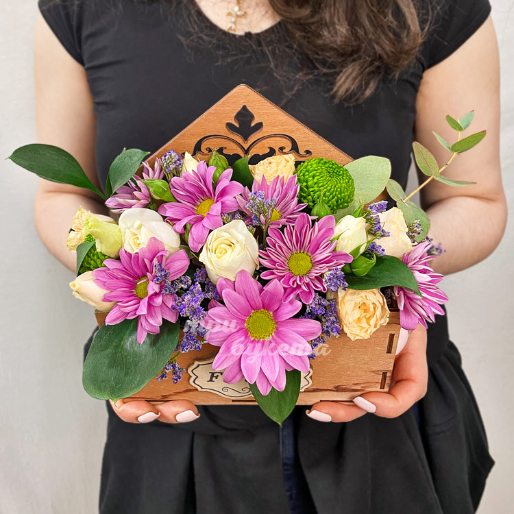 Розы и хризантемы в ящичке